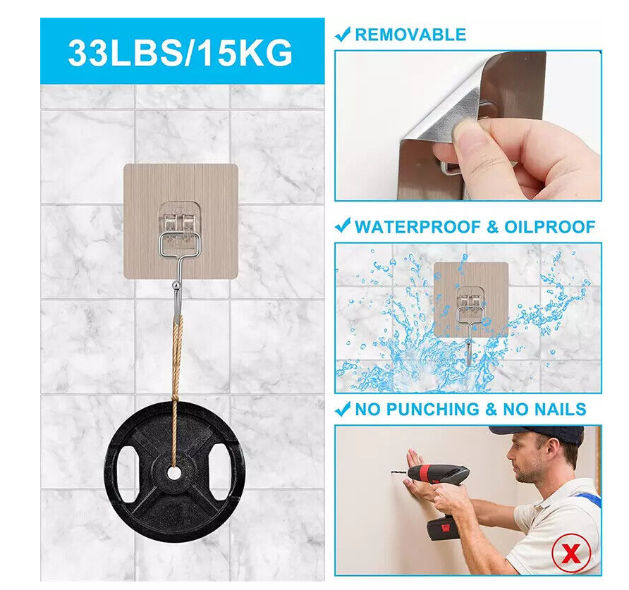 • ?Easy to Use?: There is no need for messy or complicated installation as the hooks are self-adhesive. Just peel off the adhesive strip and stick the hook on a smooth surface. Maximum portability:33LB