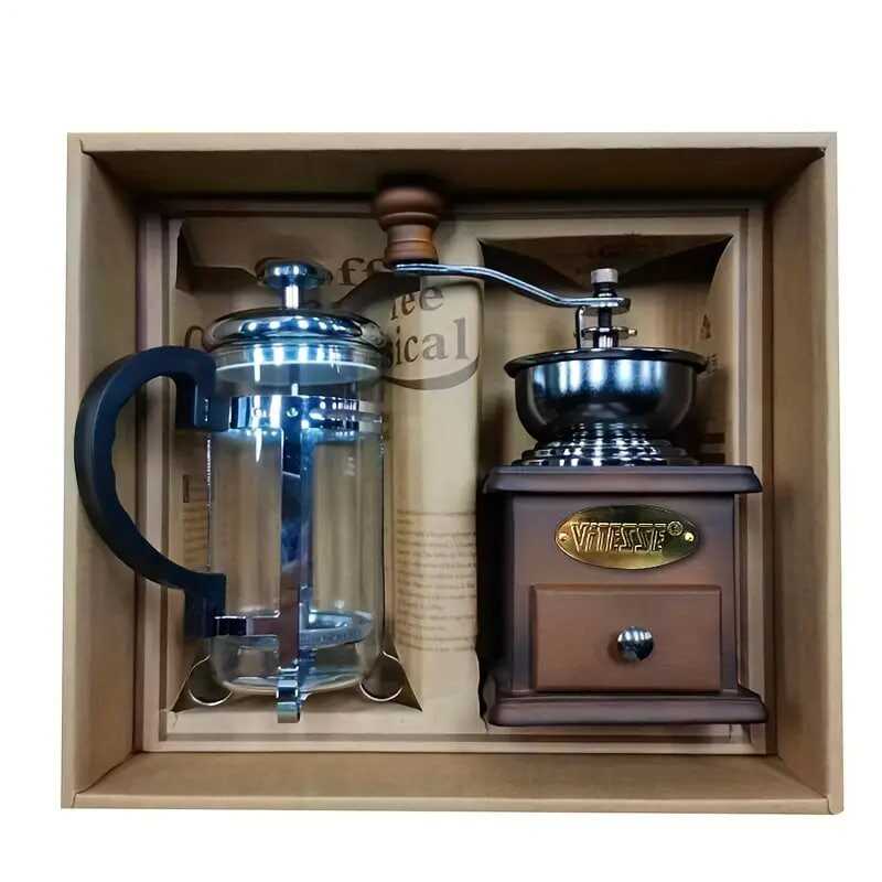1set Wooden Classic Vintage Mini Manual Bean Grinder Press Pot Set Kitchen Coffee Utensils Home Handheld Coffee Bean Grinder Gift Box Set Of Boutique Products