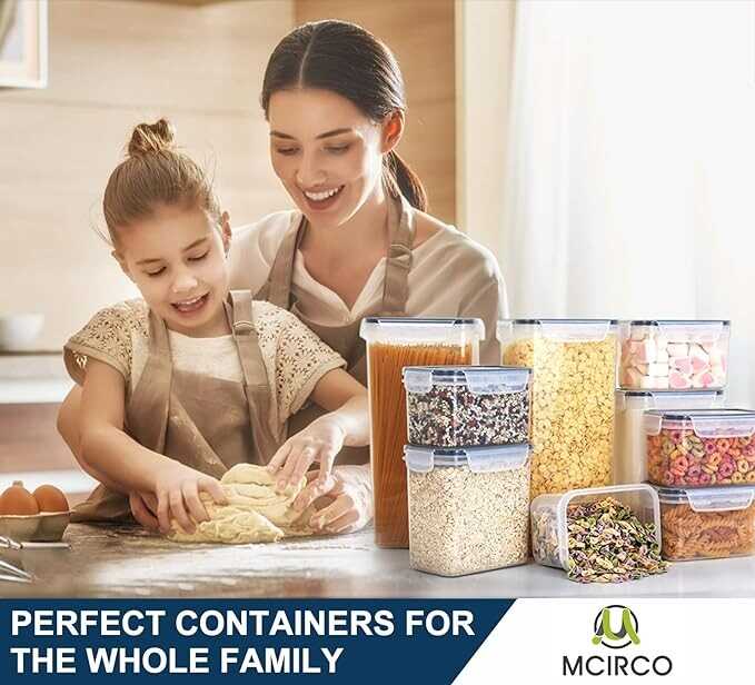 This set of containers contains 25 pcs containers in 4 different sizes . Each one has an airtight locking lid, convenient and easy to store cereal, flour, sugar, pasta, rice, snacks, coffee, cookies and dry food. They stack neatly and nest easily.