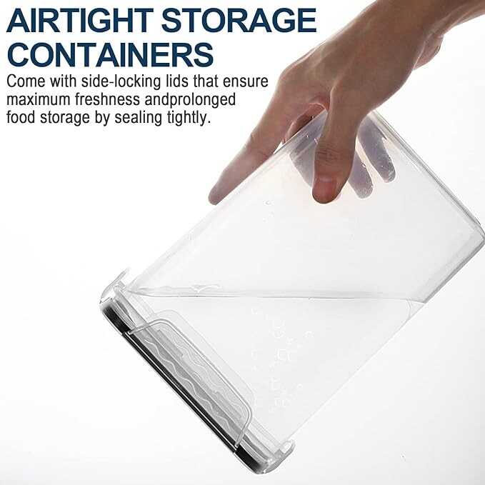 • AIRTIGHT LIDS: The four side-locking lids with black silicone gasket seal these storage containers firmly, protect your food from pests, as well as moisture and air oxidization while keeping it dry and fresh, prevent liquid food from spilling. All have the same lids which means you don’t have to worry about matching lids to containers after each wash. Please make sure the lid is is lined up correctly, it becomes a snap to close. Easy to clean and dishwasher safe.