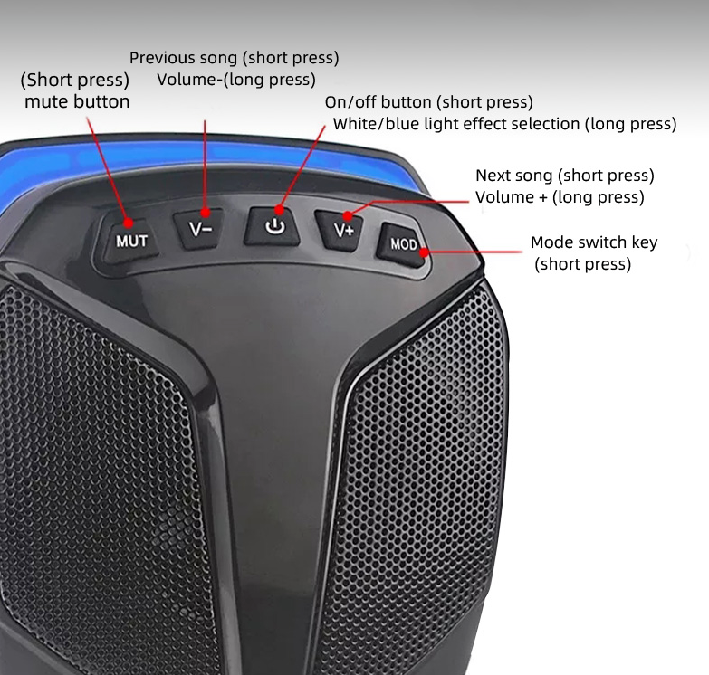 1. Speaker Dimension: 5" W x 6-1/4" L x 5-3/4" H. 2. Built-in amplifier. No additional amplifier is needed. Features: 1) Built-in Bluetooth 4.0 Receiver 2) USB Input(USB drive) 3) microSD Slot 4) Built-in FM Radio 5) White / Blue LEDs Effect Specifications of the band FM: Cover: 87 - 108 (± 0.55MHz) Sensitivity: ≤11dB Distortion: ≤0.5% SNR: ≥60dB Amplifier Specifications: Input Voltage: DC 10-16 V Input Sensitivity: 100MV-3000MV Rated Input Power: 2 x 20W Peak Power: 180W Channel: 2.0 Wireless transmission range > 15m Response Frequency: 20Hz-20KHz S/N: >80dB USB: Support USB Drive in mp3 format USB Charging: No Speaker Specification: Color: Black LEDs Color: White / Blue Plug and Play Speaker Core: 4" Speaker Housing Material: ABS Connector: 5-pin connector Cable length: 50" (Slave speaker) 1-1/2" to 2" Roll Bar Mounting Dimensions: 5 W x 6-1/4 L x 5-3/4 H (in.) Package Included: 1 x Master Speaker 1 x Slave Speaker 1 x Power cord 2 x Roll-cage Bar Mounting Clamp 1 x User Manual All-in-One 2 Channel 180W Peak Built-in Amplifier ATV UTV Waterproof Bluetooth Stereo Speakers System with 4" Full Range High-Performance Speaker Core. Included Heavy Duty Roll-cage Bar Mounting Clamp supports 1.5 to 2" bar size. Also fits certain motorcycle engine crash bar. FM Radio Receiver Built in. Support USB and microSD Card MP3 files. Support USB Charging. Blue and White LEDs Light Effect. Perfect for Can-Am ATV UTV Pioneer Polaris RZR Wolverine Yamaha YXZ Kawasaki Mule 4 Wheeler Jeep GoKart Golf Cart Electric Bike Marine Boat. Overall 5" Width Matte Black Speaker Housing with Glossy Black "T" Style Mesh Screen. Waterproof Design. Built with High-Quality ABS Material. 50" Long Speaker Cable(Slave speaker). 120" Long Power Cord for Easy Custom Installation. Bluetooth 5.0 Wireless: Stream your favorite music and radio channel from your smartphone. Compatible with iPhone 4 / 5 / 6 / 7 / 8 / X / XR / XS Max, iPod, Samsung Android Galaxy S Note Series and any smartphone devices. Support Bluetooth Wireless connection up to 15 meters. Superb Crystal Sound Quality. Advanced IP56 Waterproof Design. Great for outdoor use. Easy Installation: Comes with all necessary hardware and wiring. Plug and Play. Standard 12V Power Connection. |