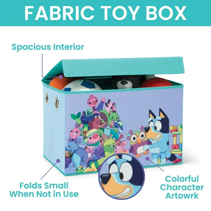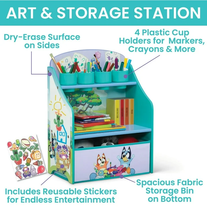 Bluey 3-Piece Art & Play Toddler Room-in-a-Box by Delta Children – Includes Draw & Play Desk, Art & Storage Station & Fabric Toy Box, Blue