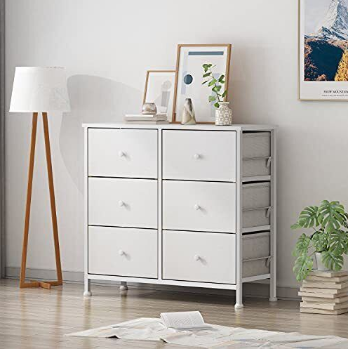 [White Dressers & Chests of Drawers]: Features 6 removable storage drawers made of high-quality non-woven fabrics, wooden front , Wooden handle is not only convenient but also beautiful,no matter kids or adult. Overall dimension: 31.5''*11.8''*28.7''.Drawer dimension: 14.6’’*11.8’’*7.9’’. [Wooden Top and Front ]: This white cloest dresser drawer organizers has water-resistant wood top and particleboard drawer front,offer stable support and ensure years of use,convenient to clean. [Strong and Sturdy System] : High quality steel frame,each drawer has a special Velcro strips to keep the drawers always at their slots,super easy to slide in and out but will not bend or fall down. anti-tipping straps ensure the safety of your energetic kids. [Easy Assembly and Move]: Easy to assemble with hardware included in half an hour,4 adjustable feet protect your floor from scratches. It's lightweight so you could move to any room you want to be tidier easily. [Mutifuction Fabric Dresser]: Smaller dimension with larger capacity fits everywhere in your house for closets, bedrooms, nurseries, playrooms, entrance passages,office, nightstand etc. 100% Satisfaction customer service before and after purchase. |