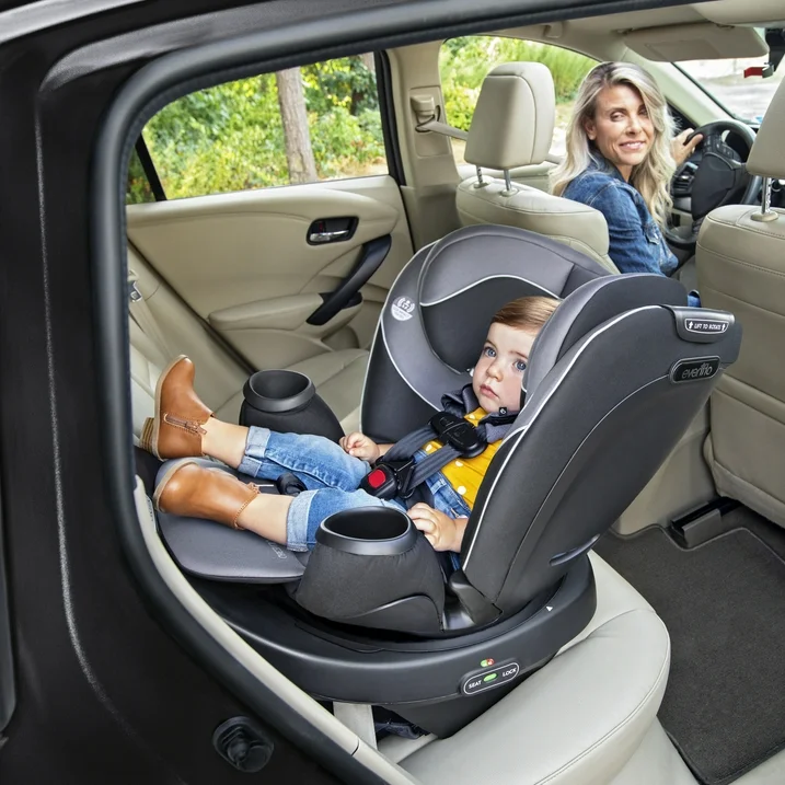 The future of car seat innovation is here: Introducing the Evenflo® Revolve360™ Rotational All-In-One Car Seat - the only car seat in America that rotates in all modes of use. Once again, Evenflo is leading the way with this extended use, rotational seat that’s easy to turn and easy to install - it's the only all-in-one rotating car seat in America with one-time install. Designed for kids weighing 4 – 120 lb, the Revolve360 makes loading and unloading your child a breeze (and easier on your lower back!)—in all three modes of use. Install it just once and you’re done, thanks to the Sure360™ Safety Installation System, featuring the LockStrong™ bar, which pulls down to lock the car seat base into place and Tether360™, which helps keep the seat positioned and secure in the car. Packed with conveniences, the Revolve360 also surrounds your child with everyday comfort and safety. From birth to ten-years-old, it’s truly a revolutionary way to get around. At Evenflo, we go above and beyond government standards to create car seats and bases that are safe. The Evenflo Revolve360 Rotational All-In-One Car Seat is side impact and rollover tested, as well as tested for structural integrity at energy levels approximately 2x the federal crash standard. If you need help installing your car seat base, our ParentLink® customer service experts offer help online in real time. Get live video support with a certified car seat safety technician to ensure proper vehicle installation, so you can drive with confidence knowing your child is protected. It's been 100 years and Evenflo continues to push the boundaries in baby and children’s gear design and innovation. We meet the needs of new generations of parents by focusing on what they really care about: leading-edge safety, smart design and technology, and convenient features that help them enjoy the journey of parenthood.