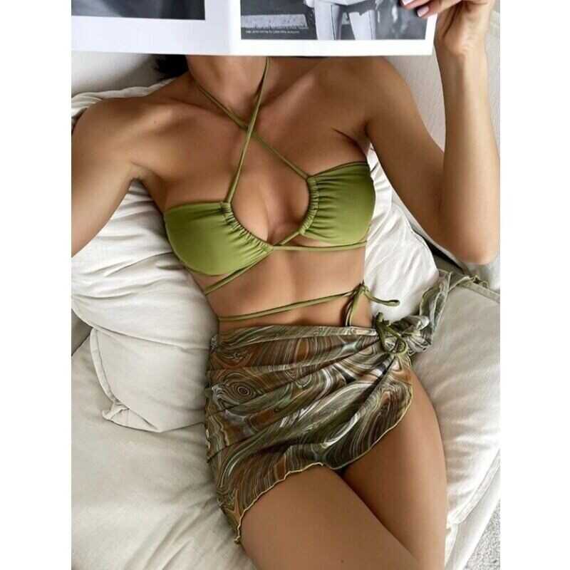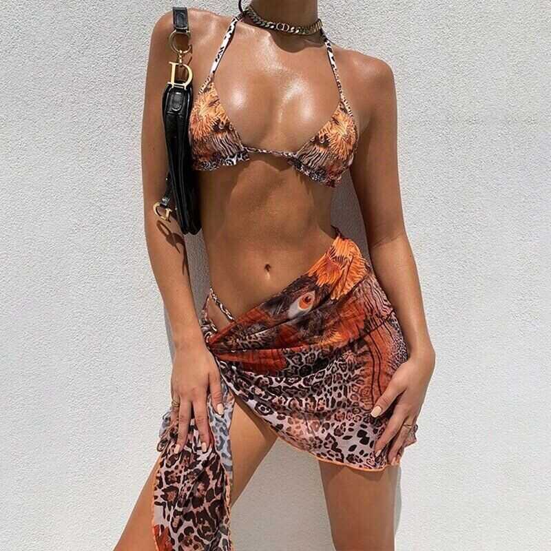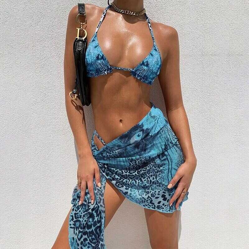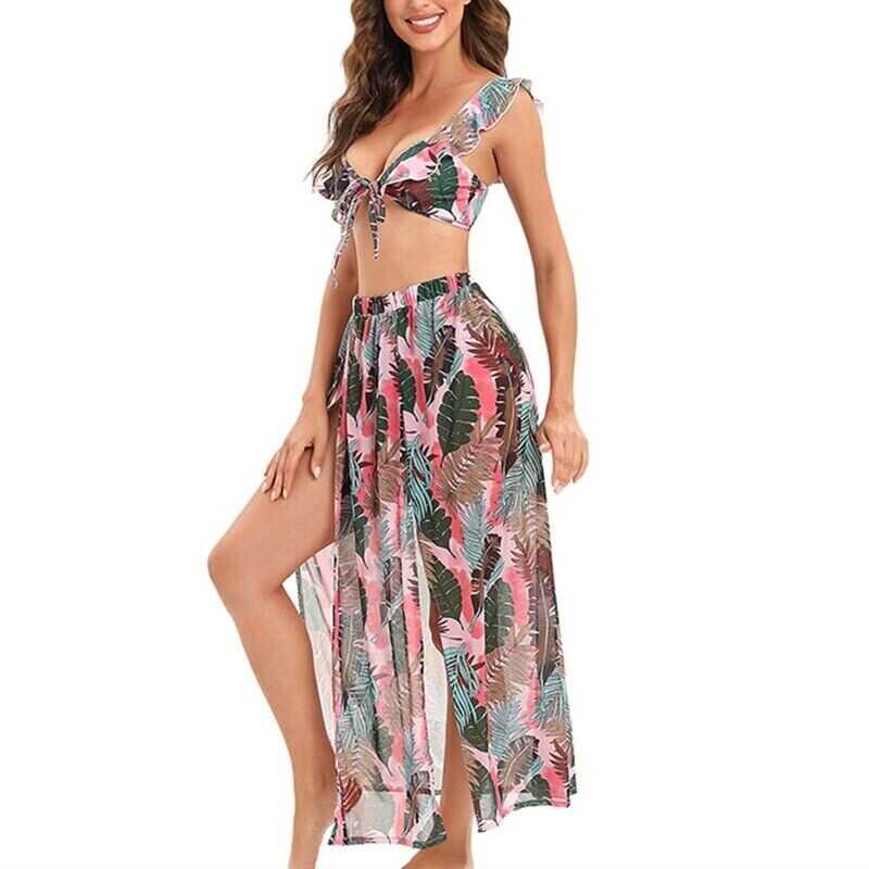 High Waist 3 Piece Bikini Set With Cover Up 2022 Women Swimsuit Print Long...