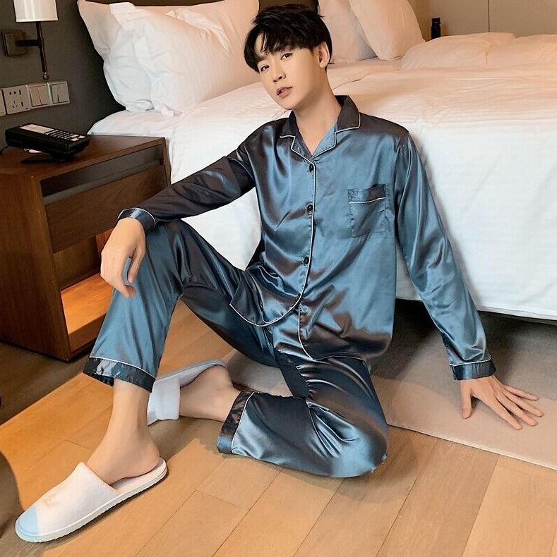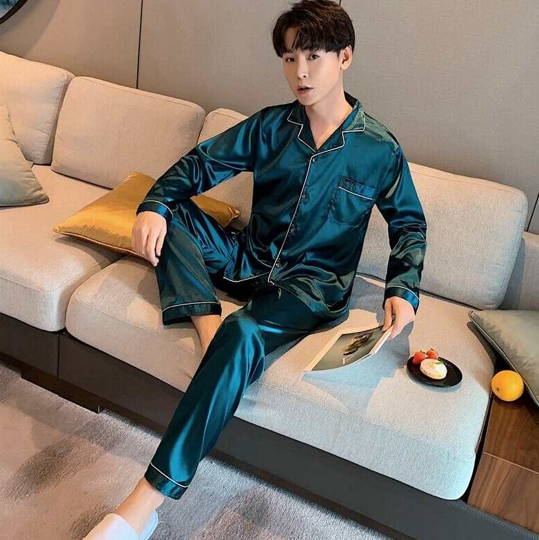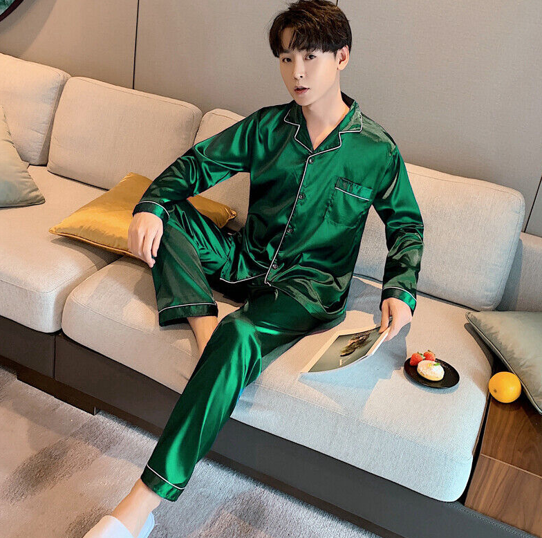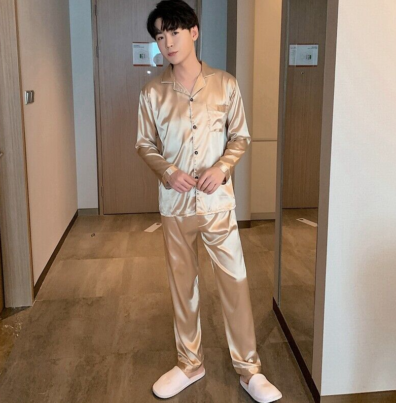 Mens Silk Satin Pajamas Set pyjamas for men Loose Sleepwear PJ Set Autumn Gift