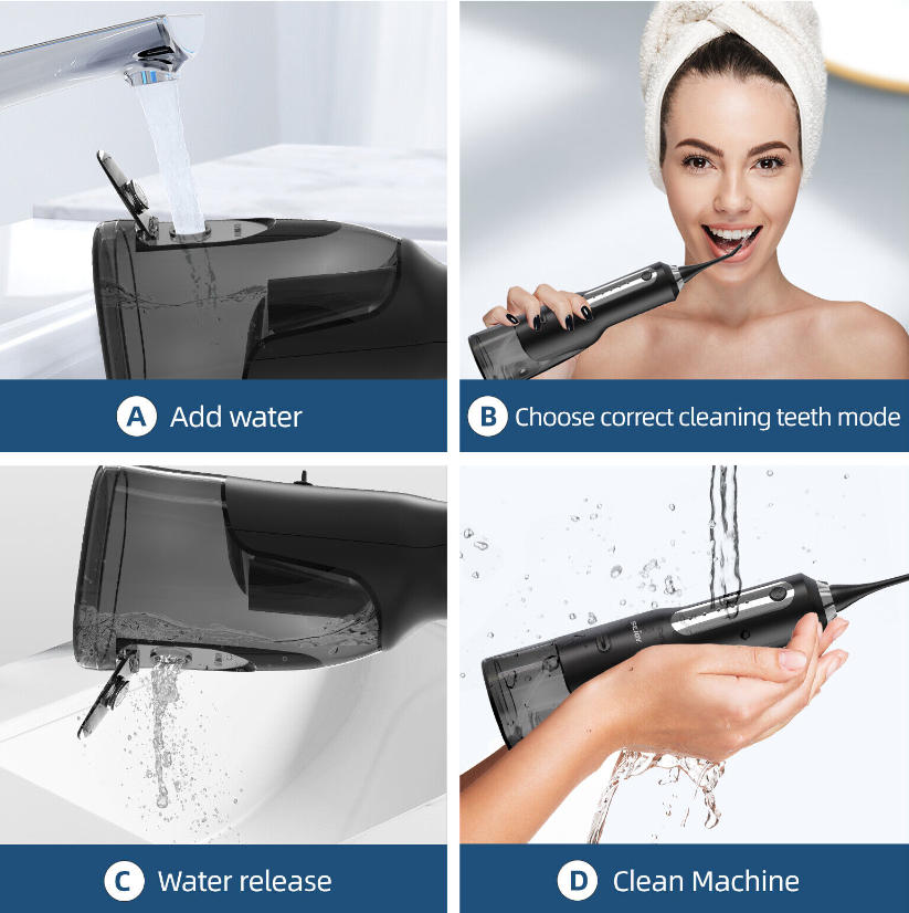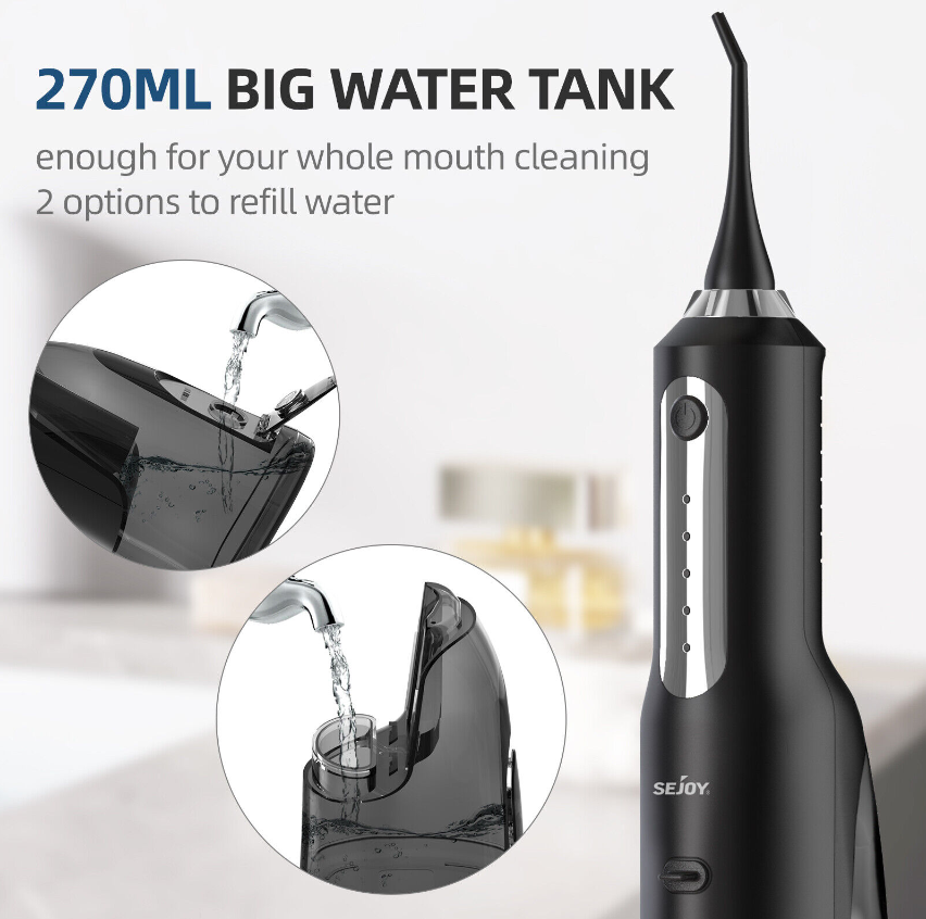 • 【Detachable Water Tank &IPX7 Waterproof】The large 270ML water tank,,saving you the trouble of always adding water. The detachable design allows easy cleaning of the interior.IPX7 waterproof design makes it easy to use the water dental flosser for showering in the bathroom,and can be washed with water.