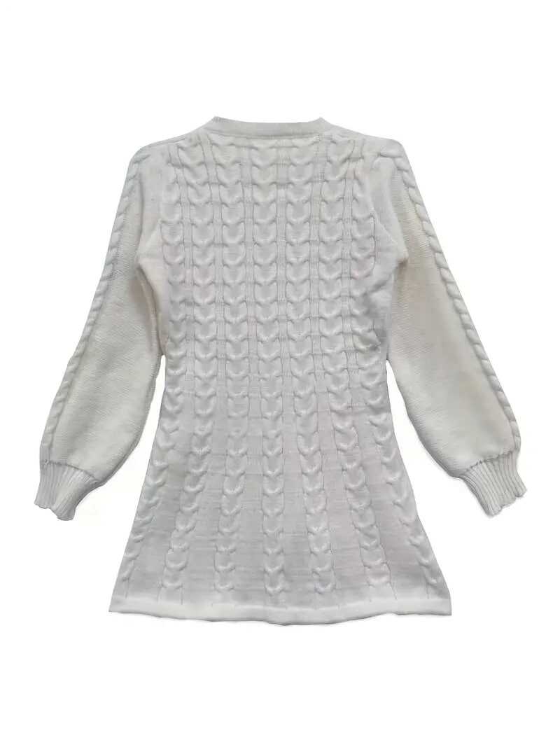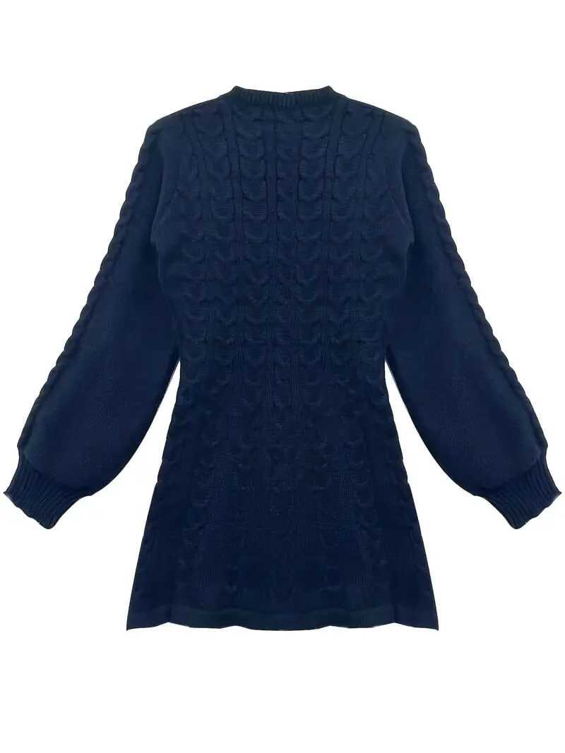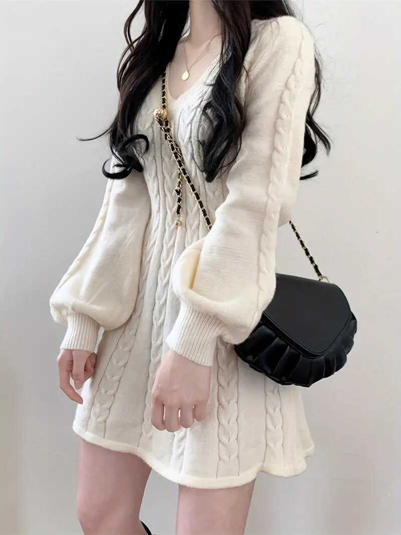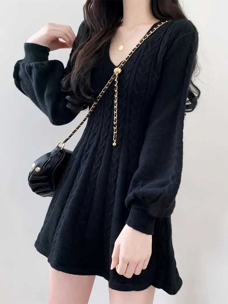 solid cable knit dress elegant v neck lantern long sleeve dress womens clothing details 0solid cable knit dress elegant v neck lantern long sleeve dress womens clothing details 0