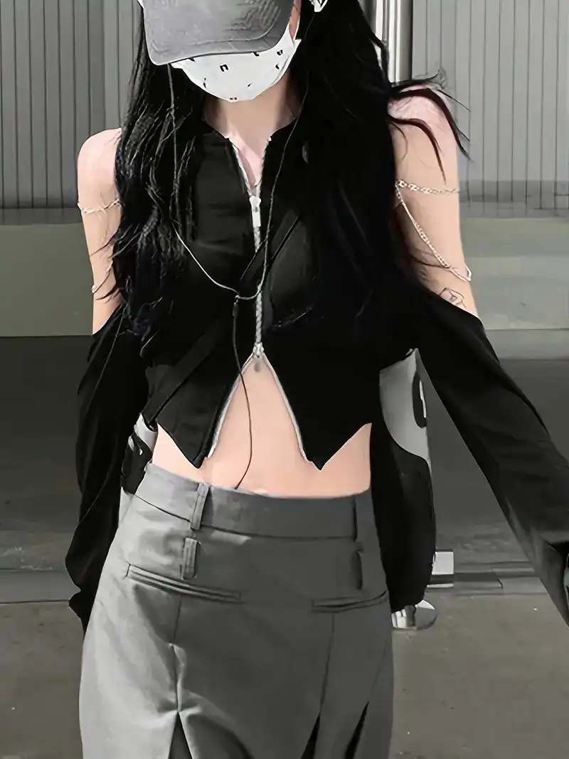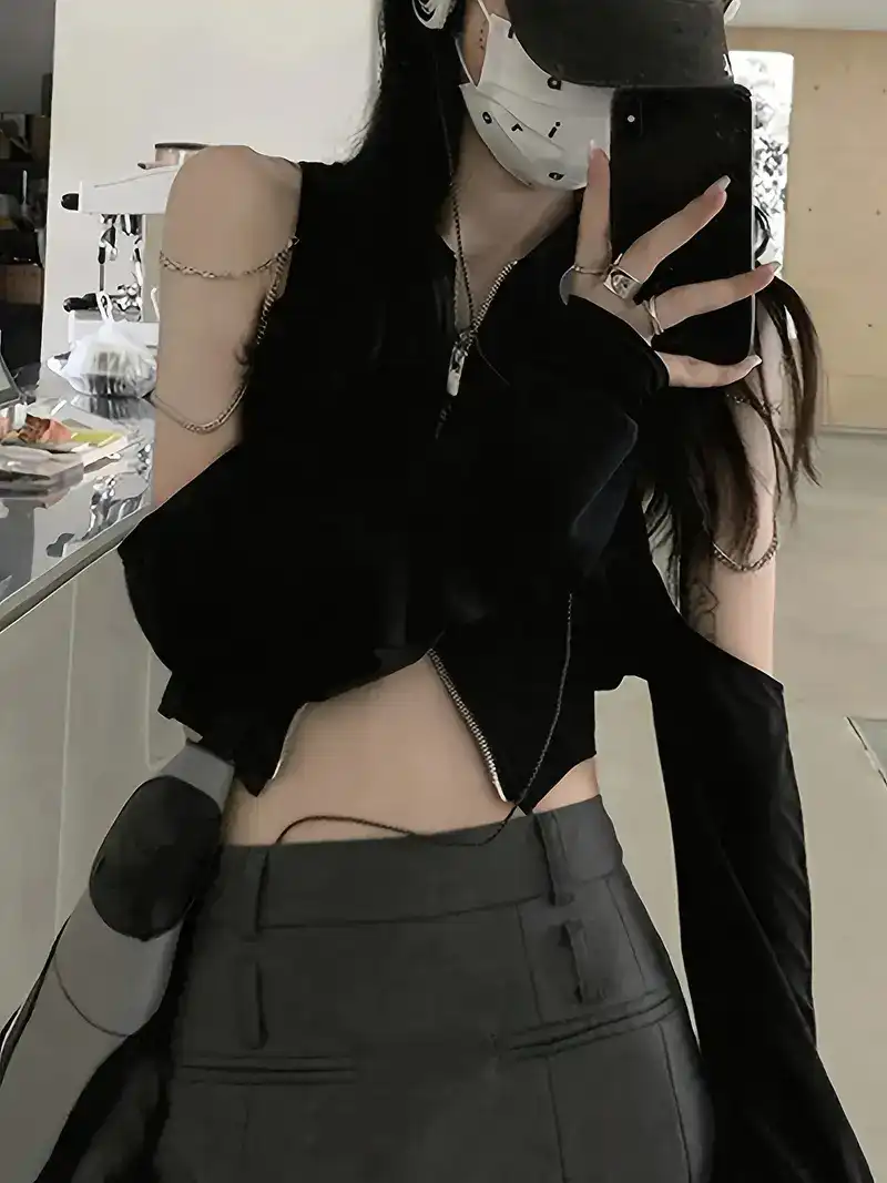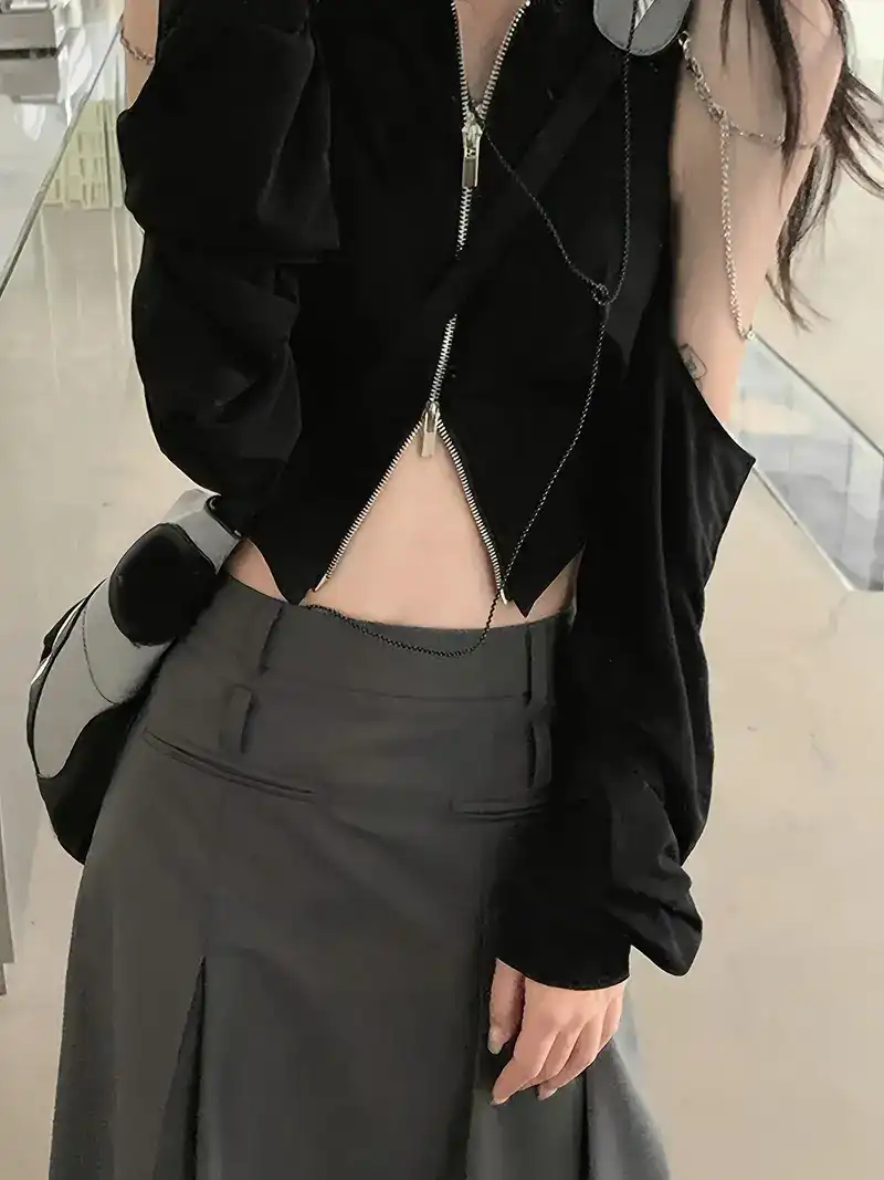 Solid Zipper Chain Decor Crop Top, Versatile Cut Out Long Sleeve Top For Spring & Fall, Women's Clothinghjhj