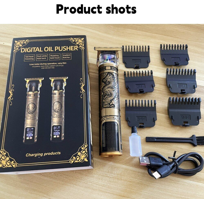 Accessories: USB charging cable, limit comb, cleaning brush, instructions.