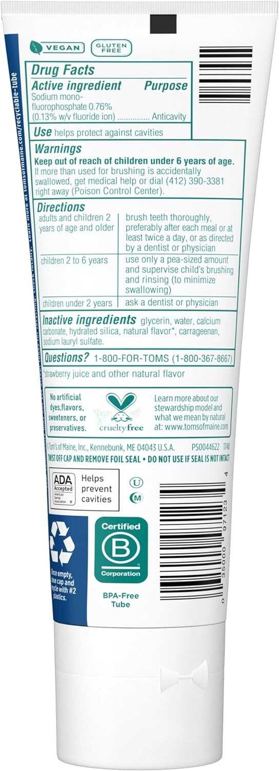 #1 Kid's Natural Toothpaste Brand, (Based in part on data reported by Nielsen through its Connect Service for the Toothpaste Category for the 52 week period ending 8/27/22, for the AOC market. Copyright 2022 Nielsen.) Hello natural cavity protection! Tom's of Maine Natural Kids Fluoride Toothpaste uses calcium and silica to gently clean your little one's teeth. Plus, the yummy Silly Strawberry flavor of this natural children's toothpaste makes brushing fun. With no artificial flavors, colors or preservatives, this fluoride toothpaste is silly enough for kids and effective enough for parents. And when you're done using your toothpaste, you can recycle the tube! Check to be sure that your tube has the blue recycling flag on it, squeeze out as much of the toothpaste from the tube as you can, replace the cap, and place the tube in your recycling bin. At Tom's of Maine, we want to empower families to live more naturally. With more than 50 years experience combining scientific know-how, naturally derived ingredients and a bit of ingenuity, we make products that are good for you and the planet. As a Certified B Corp, we hold ourselves to the highest social and environmental standards. Plus, we're committed to supporting local communities for meaningful change, donating 10% of our profits to charities supporting health, education and the environment. We call this "doing good, for real," and it impacts everything we do.