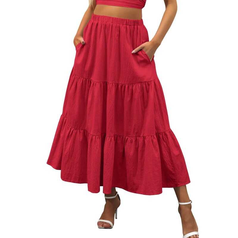 Women Boho Elastic Waist Pleated A-Line Flowy Swing Tiered Long Skirt Dress