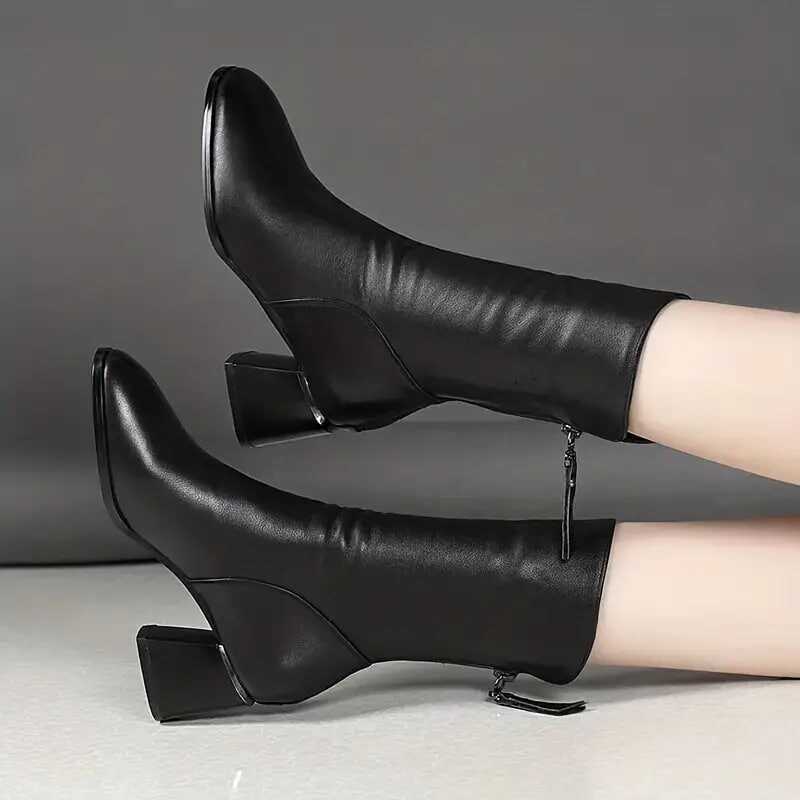 womens solid color boots back zipper chunky heel casual soft sole boots mid calf versatile winter shoes details 2womens solid color boots back zipper chunky heel casual soft sole boots mid calf versatile winter shoes details 2