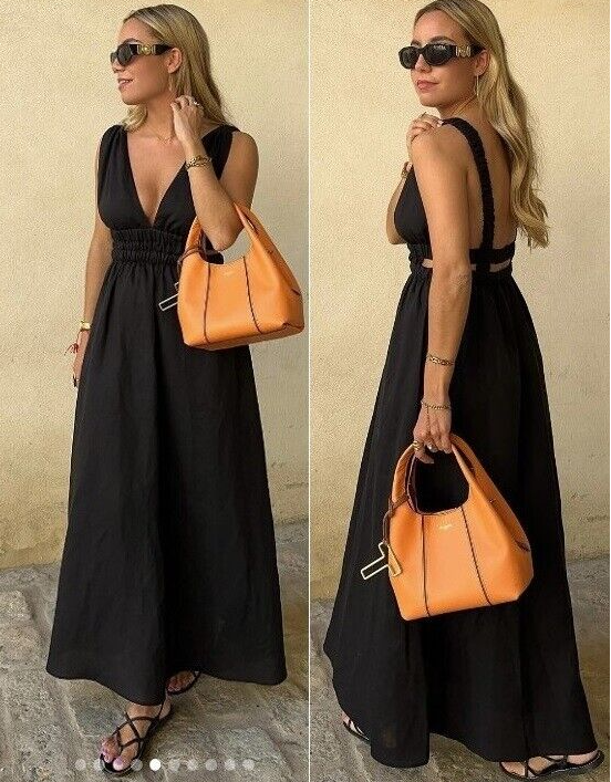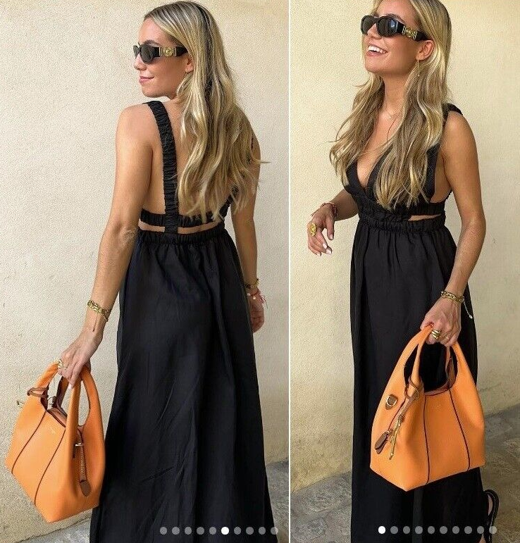 ZARA LINEN BLEND BLACK CUT-OUT V-NECK BLEND MIDI DRESS REF:4786/291