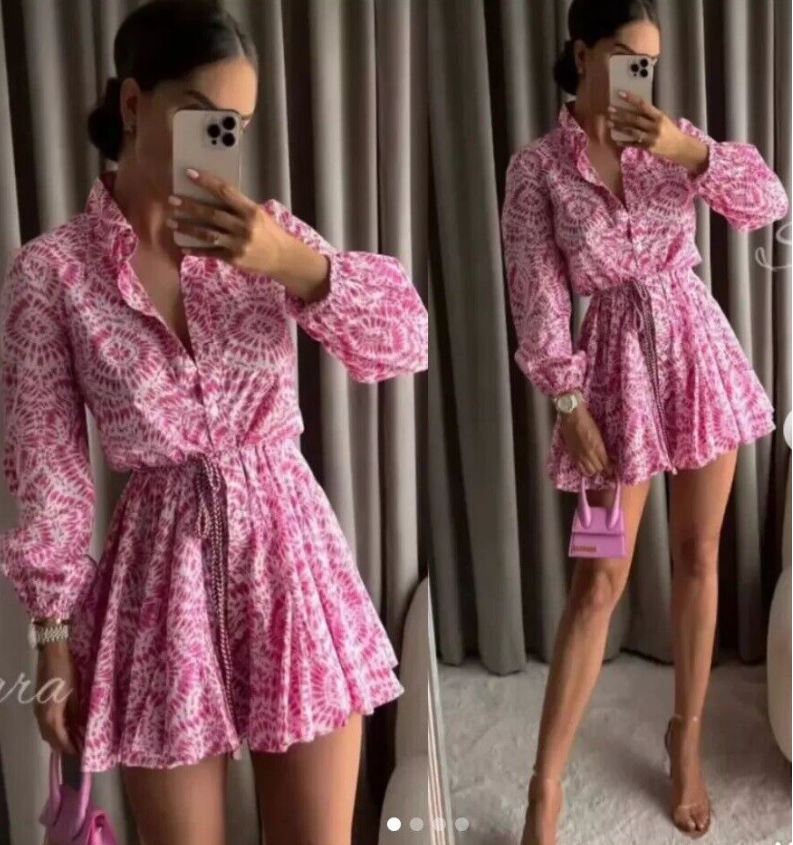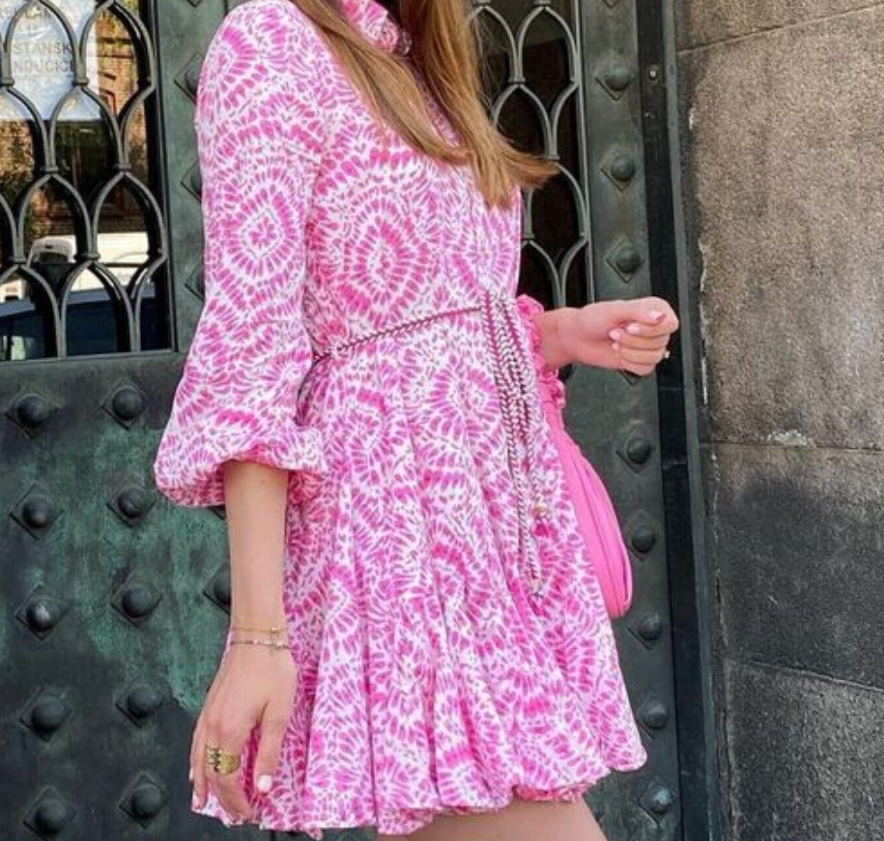 ZARA PINK TIE DYE FLORAL PRINTED MINI SHIRT DRESS VOLUMINOUS FULL SKATER SKIRT WITH BELT